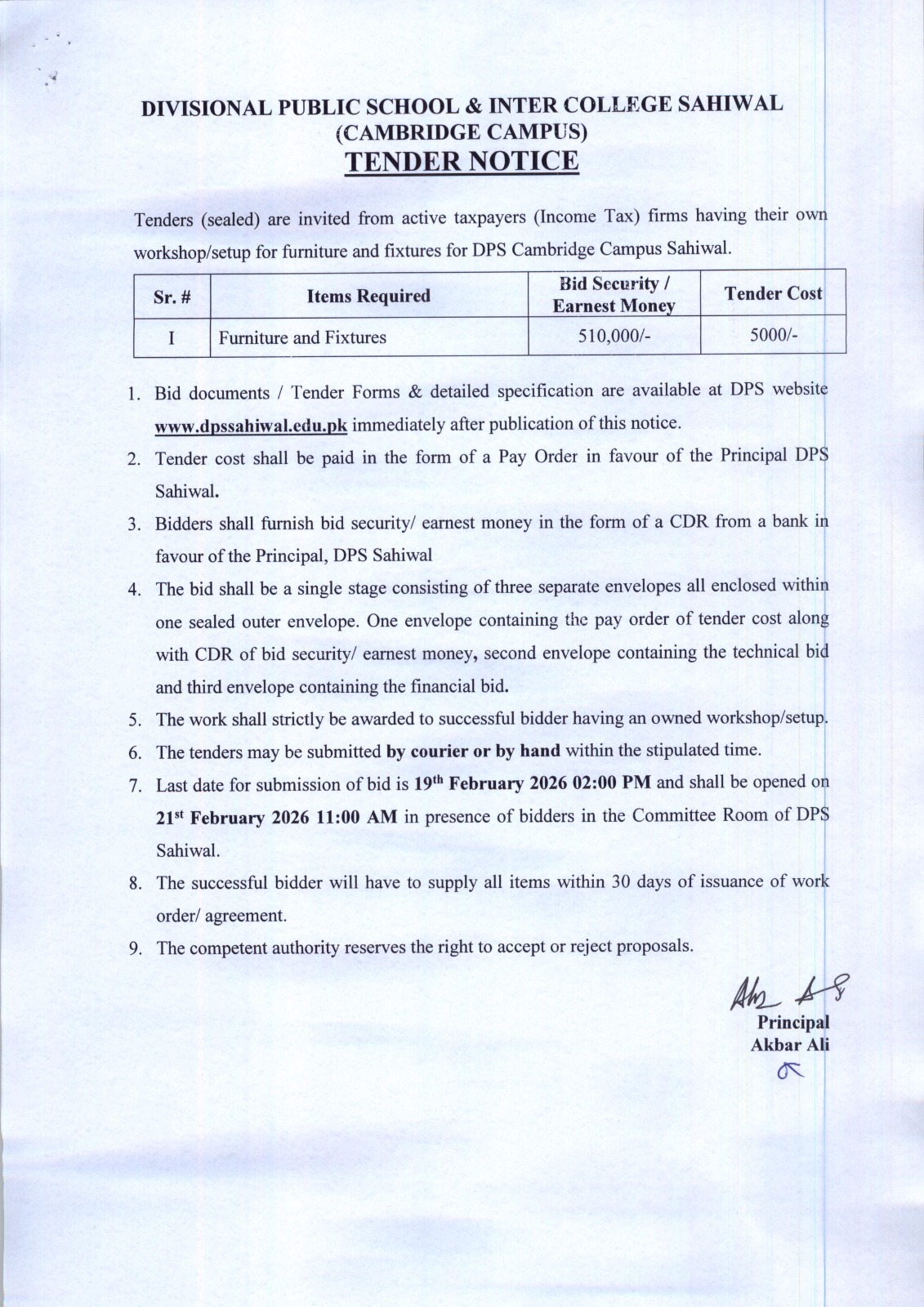 Tenders are invited from General Sales Tax Registered firms / Suppliers for the Printing of the Prospectus (with Admission Form) with an approximate cost of Rs.620,000/- for the Divisional public school & Inter College Sahiwal.